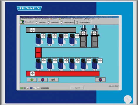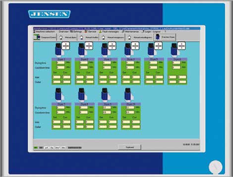 Each dryer has its own switch panel with PLC control and own power supply. The operation and programming of the dryer is carried out by a separate compound control that connects all dryers with each other. A panel PC with a colour touch screen operates and visualizes the dryers and their transport conveyors, if existing. The JENSEN service helpdesk can establish a remote maintenance of the dryer control via an integrated Ethernet interface. Dryers of an isolated application are equipped with a smaller graphic operating terminal. Each dryer disposes of 100 free programmable programs.